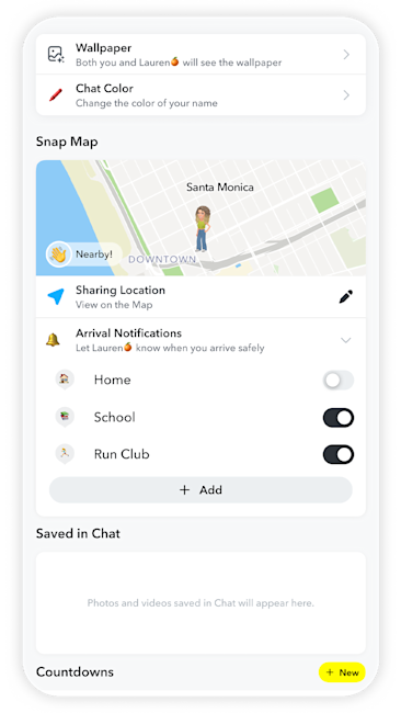 Snapchatユーザーは、自宅以外の場所に対して、1回限りのアラートまたは定期的なアラートを設定できるため、目的地に到着したことを簡単かつ自動的に共有できます。到着通知は、旅行中の夜に帰宅したことを誰かに知らせたり、毎週のクラス、練習、会議に到着したことを自動的に共有したりするなど、日常のあらゆる瞬間に役立ちます。メッセージを送信することを意識する必要はありません。